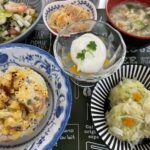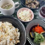 ほっくりとした里芋ごはんに、れんこんの挟み揚げの香ばしさがよく合い、きのこシーザーサラダが全体に秋らしい深みを添えます。豆腐の和物は舌にすっとなじむやわらかさで、味噌汁の香りとともに心がほっと落ち着く一品に。
