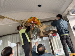大きなしめ飾りのおかげで、入口が一気に華やかになりました。